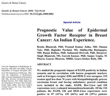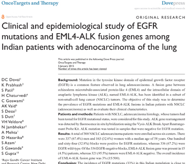 - Clinical and Epidemiological Study of EGFR Mutations and EML4-ALK Fusion Genes Among Indian Patients with Adenocarcinoma of the Lung at Oncology Forum 2013, Zagreb, Croatia